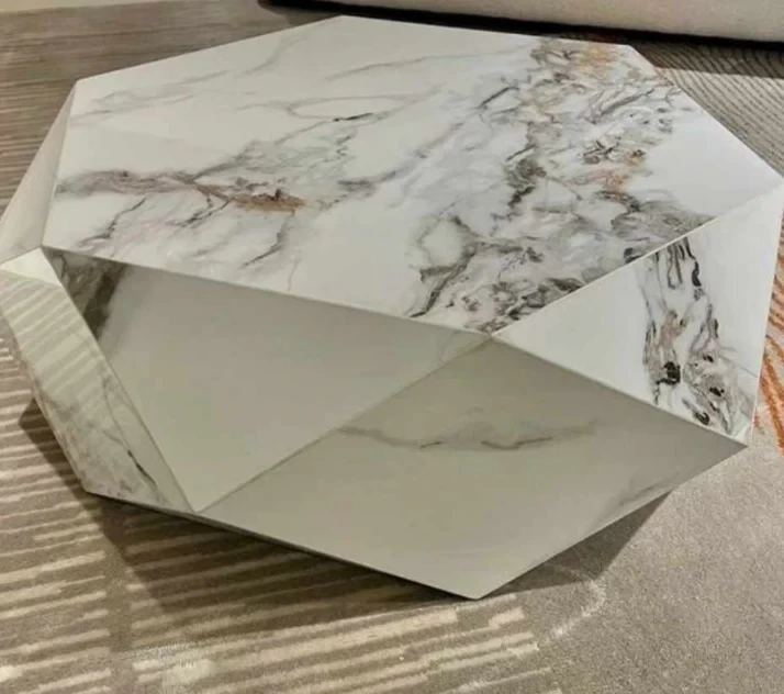 This is a modern, geometric-shaped coffee table featuring a white marble finish with brown and gold veining. The table has a multi-faceted design with sharp angles and a smooth surface .