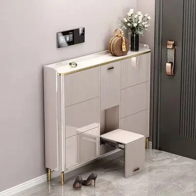 This is an elegant and modern shoe cabinet designed with both functionality and aesthetics in mind. The cabinet features a luxurious rock slab top, which adds a touch of sophistication and durability. The body of the cabinet is composed of multiple tilt-out drawers, each of which operates with a convenient push-to-open mechanism, allowing for easy access to your footwear collection.