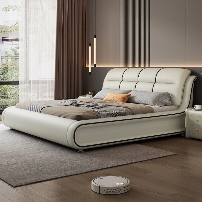 This leather bed with storage combines contemporary style with practical functionality. The bed features a sleek, upholstered leather frame available in multiple color options, allowing you to match it seamlessly with your existing decor. The rounded edges of the frame add a modern touch, while the sturdy build ensures durability and support.