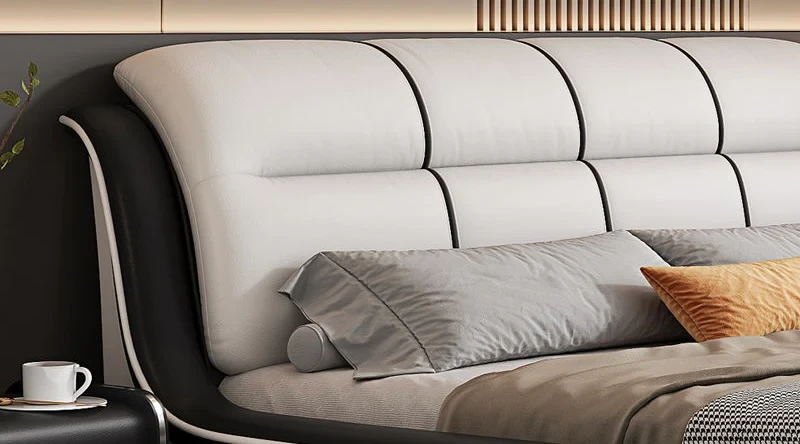 The headboard is designed with a padded leather finish, adding an extra element of comfort for lounging or reading in bed. The bed's design combines both style and practicality, making it a versatile and luxurious addition to any bedroom.