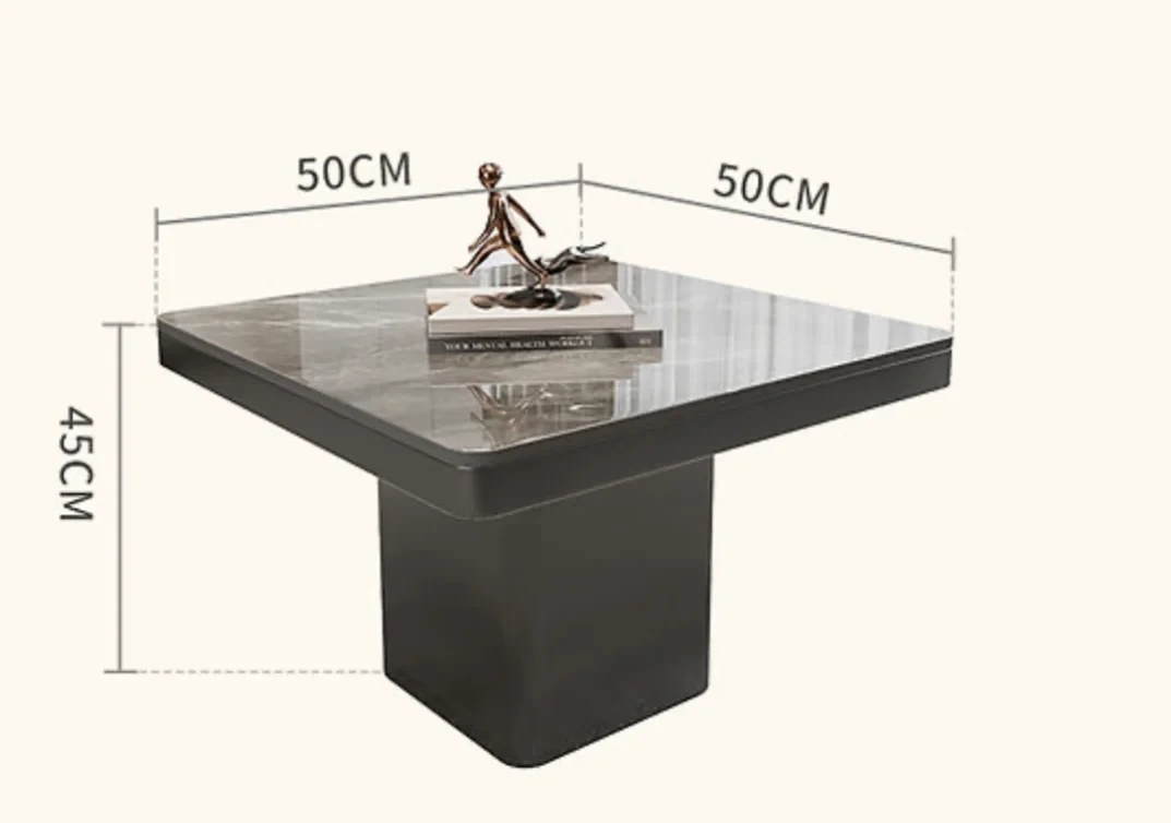 This coffee table set consists of two contemporary, rectangular tables with sleek, modern designs. The tables are different in height, with one standing at 45 cm and the other at 36 cm, creating a dynamic, layered look when placed together. Each table features a polished marble top that adds a touch of luxury, complemented by a dark, glossy base that offers stability and a bold contrast to the lighter top. The rounded edges of the tables provide a softer, more inviting aesthetic, making this set a perfect addition to a sophisticated living room setting. The dimensions are 70 cm by 50 cm for the smaller table and 70 cm by 50 cm for the larger table, making them versatile pieces that can be used separately or together for a cohesive look.