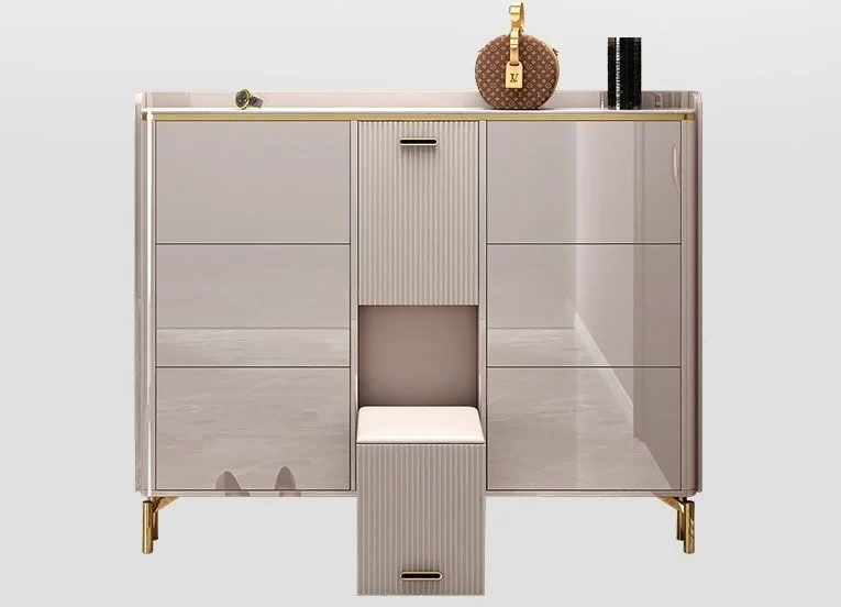 This is an elegant and modern shoe cabinet designed with both functionality and aesthetics in mind. The cabinet features a luxurious rock slab top, which adds a touch of sophistication and durability. The body of the cabinet is composed of multiple tilt-out drawers, each of which operates with a convenient push-to-open mechanism, allowing for easy access to your footwear collection.