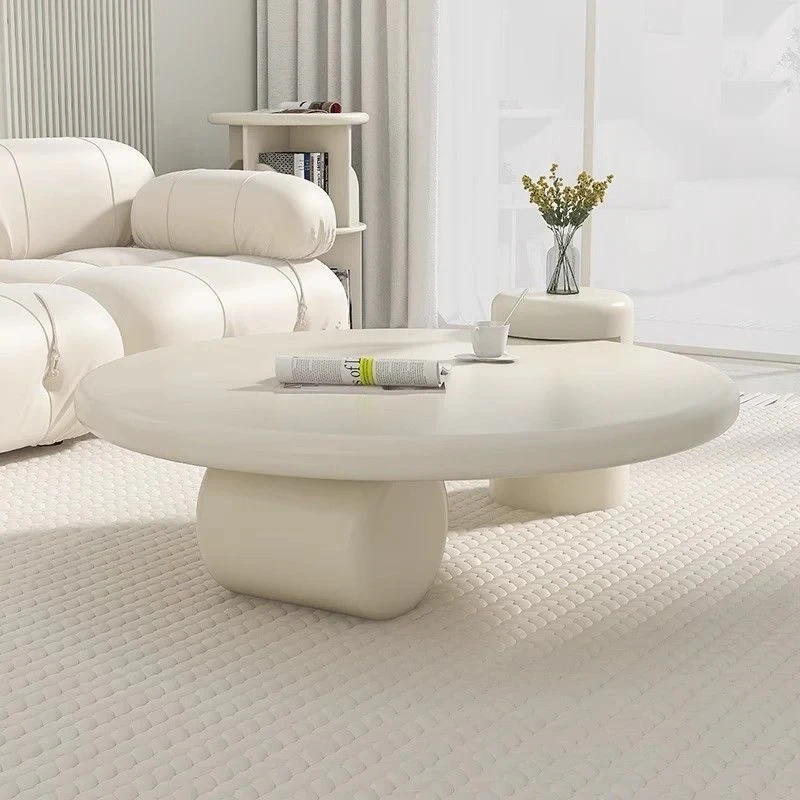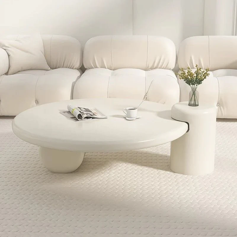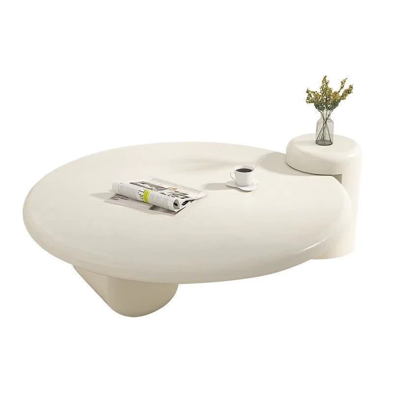 - The coffee table features an interesting asymmetrical structure, combining a large round main surface with a smaller raised circular platform for additional decor or functionality.