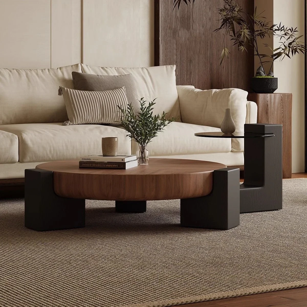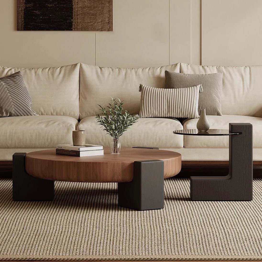 - The central piece is a large, round wooden coffee table with black rectangular legs. The wood appears to be of natural finish, enhancing the room's warm and neutral aesthetic.