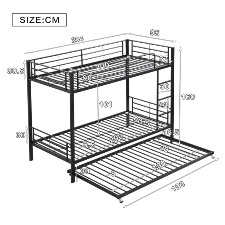 Size and configuration: The bunk bed is designed for mattresses with dimensions of 90 x 200 cm and 90 x 190 cm in the pull-out lower bed.