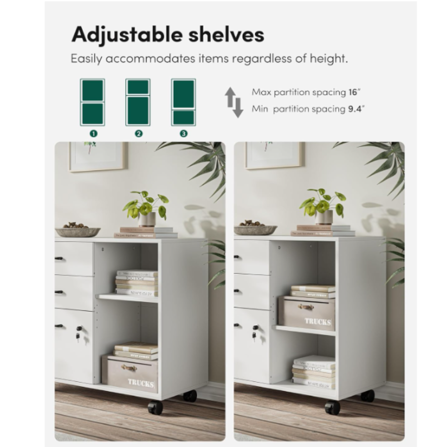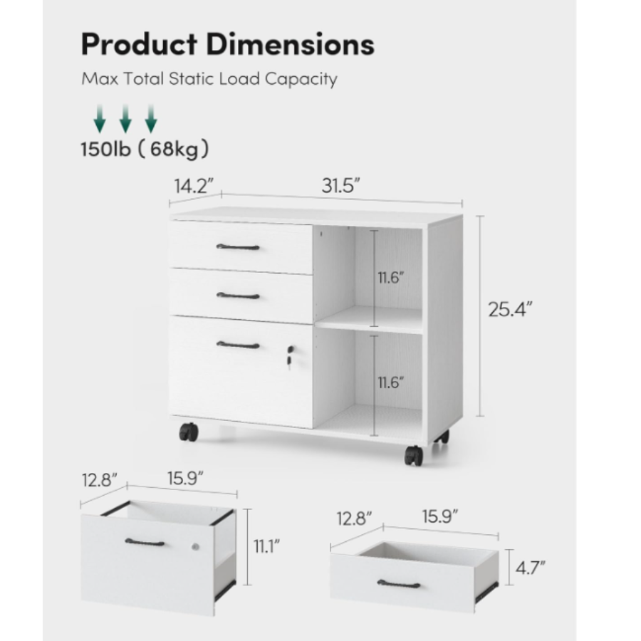 Drawer with Lock: The Vizibo file cabinet has 3 drawers. The top two drawers provide ample storage space for your small items. The bottom drawer with lock keeps your Legal/Letter/A4 hanging files organized and secure, and extends fully for easy access.